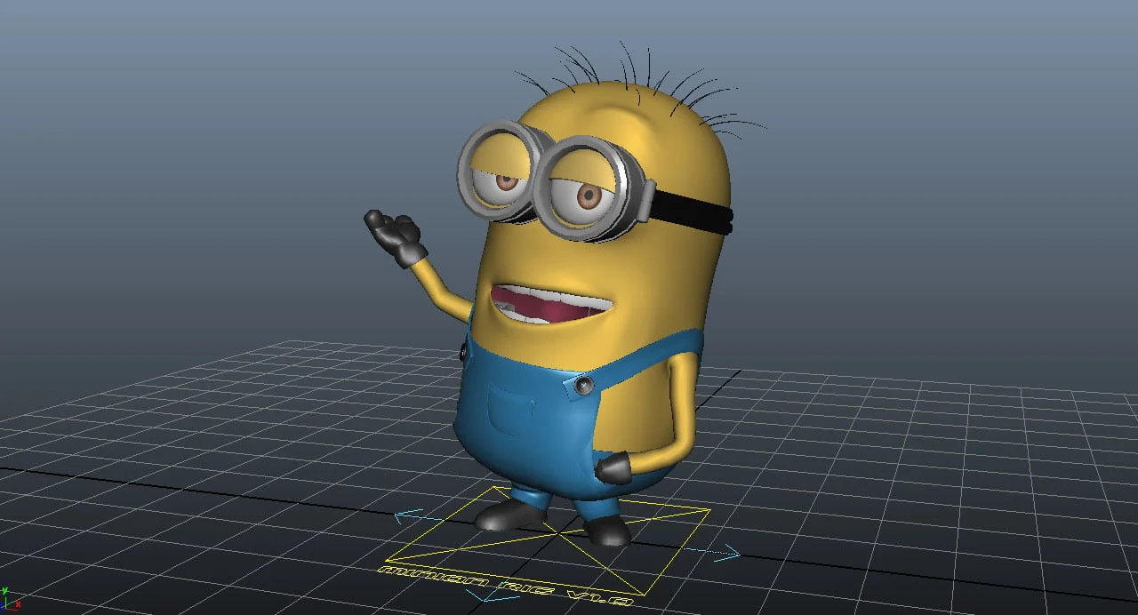 A rigged Minion character model featuring an extensive animation control system. The rig includes stretchy inverse kinematics for the back and limbs with bendy joints, alongside standard FK/IK switching and space switching for the arms and legs. It provides specific controls for secondary elements like hair, cloth, and eyes, complete with full finger articulators and multiple foot pivots. For facial animation, the setup utilizes a basic Osipa-style interface combined with manual controls. The rig supports whole-body squash and stretch and is completely scaleable for integration into various scenes.