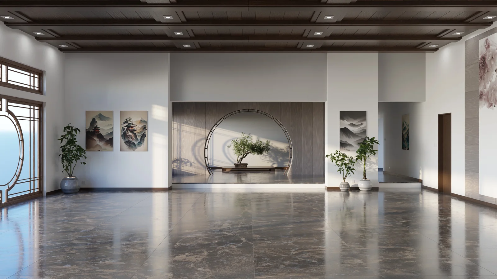 A high-polygon 3D model of a modern Asian-style living room interior. Built to real-world scale, the scene comes fully prepared with clean topology and a comprehensive lighting setup. It includes specialized Cycles materials with embedded 2K and 4K textures, allowing users to render the environment immediately upon opening the file in Blender.