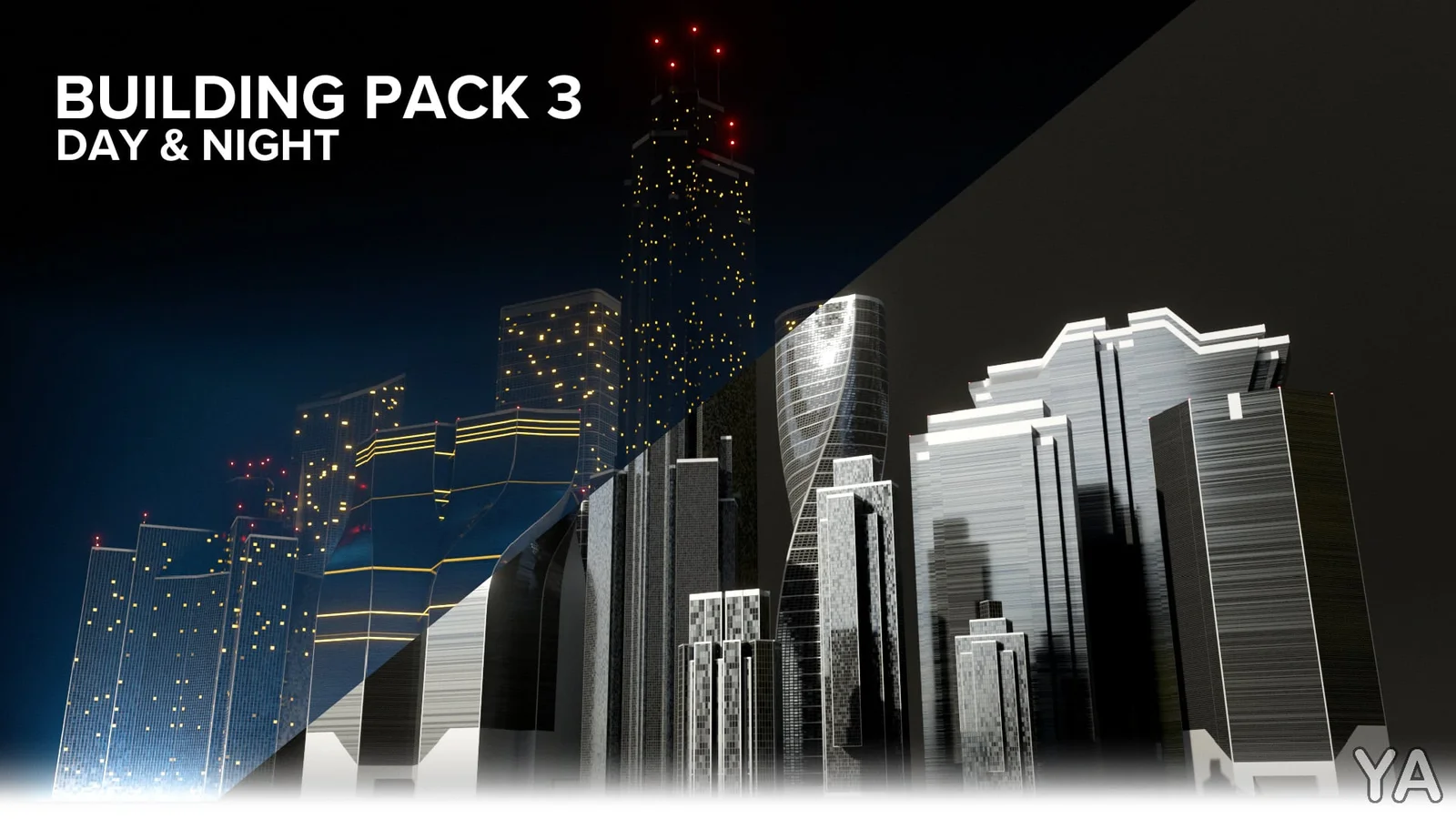This asset pack contains twelve modern building models designed for populating city environments. The models feature procedural textures built directly in Blender. Each building includes both day and night variants, equipped with adjustable window lights to suit different lighting scenarios.