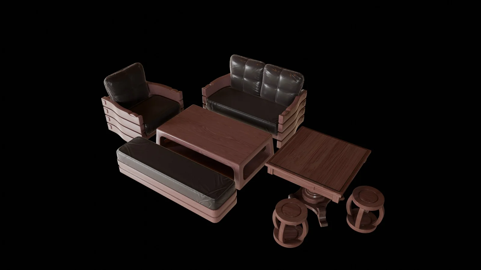 This is a 3D model collection of a modern Chinese living room furniture set. The package includes a large sofa, an armchair, a coffee table, a bench, a mahjong table, and a stool. It provides a complete seating arrangement suitable for interior architectural rendering projects.