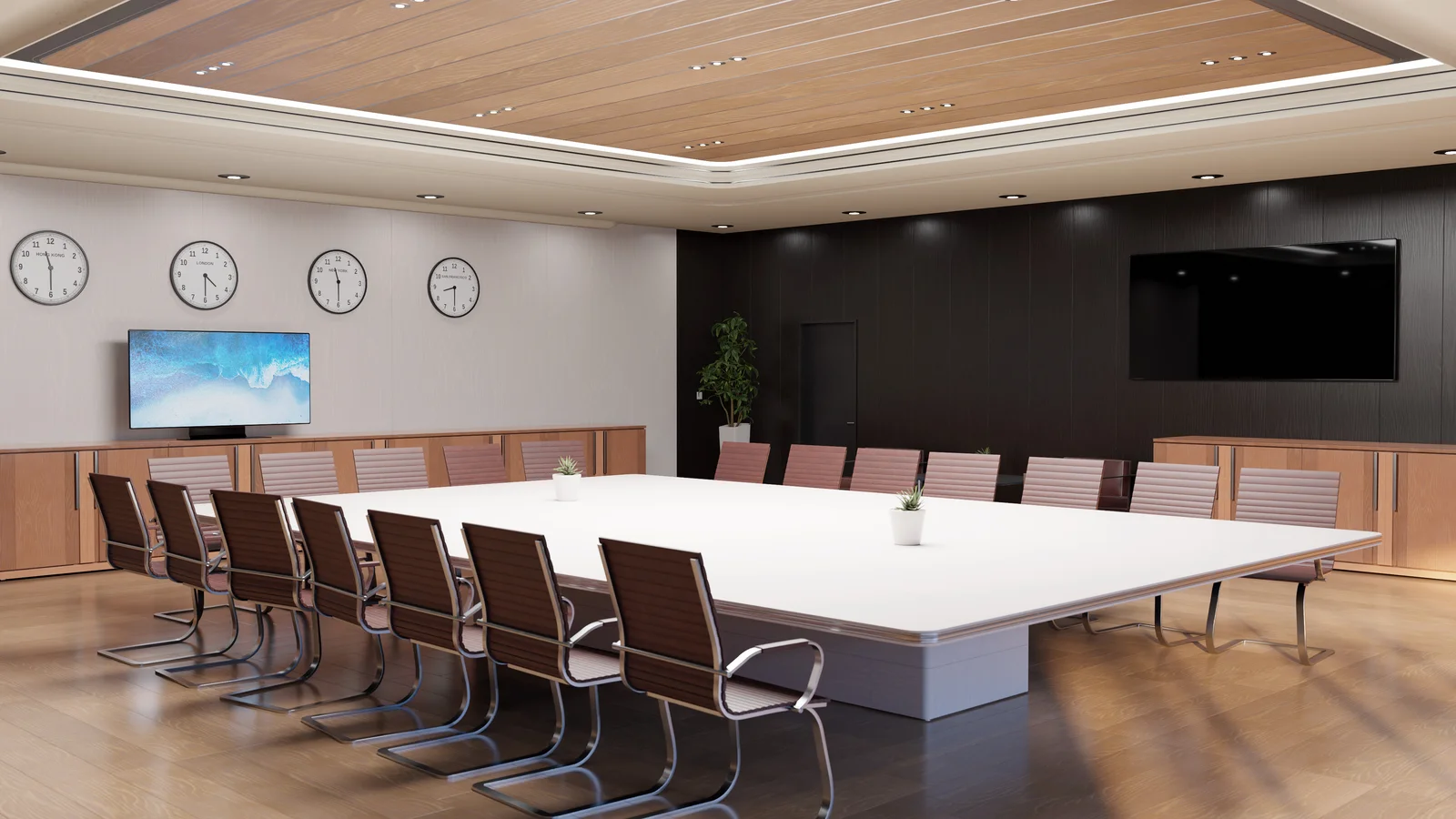 A high-resolution 3D model of a modern conference room designed at real-world scale (12m x 12m x 3m). The scene features clean topology. It is fully set up for Blender with Cycles materials and an embedded lighting setup. The native .blend file is ready for immediate rendering, and the package provides 4k and 2k textures. Additional .fbx and .obj formats are also available for use in other 3D software.