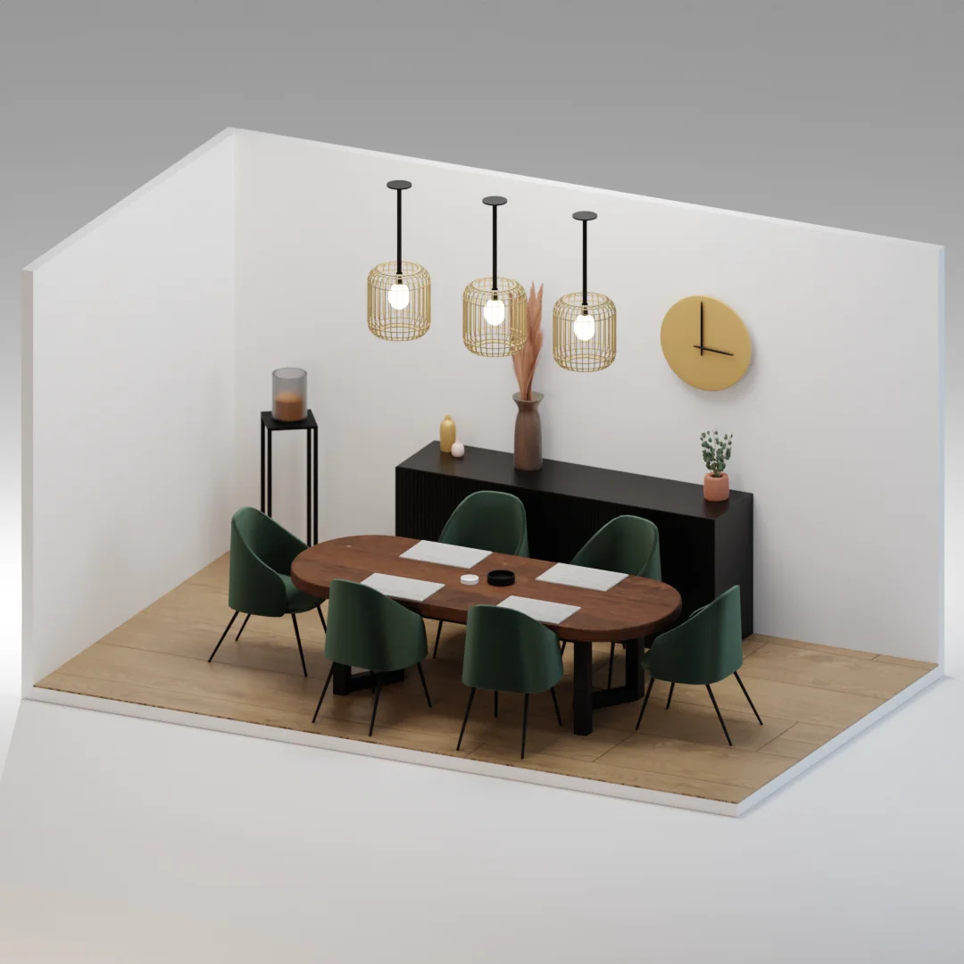 A 3D model of a modern dining room designed for isometric perspectives. The scene is provided without textures, allowing for custom material application and styling to fit various project needs.