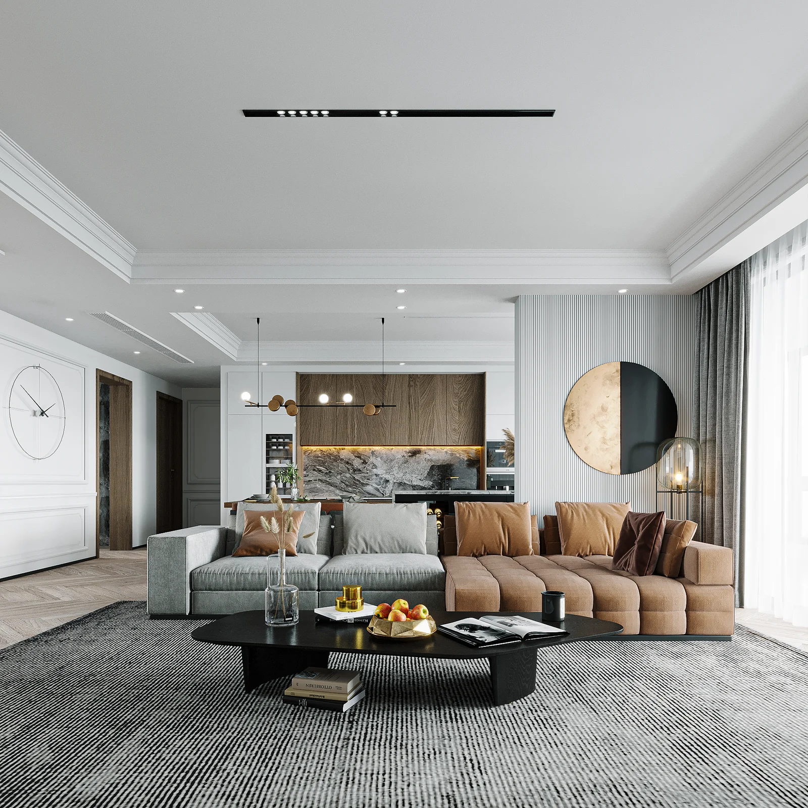 A complete 3D scene of a modern style interior. The setup features a layered file structure with named objects, materials, and textures. All UVs are laid out without overlapping. The scene includes exterior tree models and uses millimeter unit scale. While natively configured for 3ds Max, the scene is provided in FBX and OBJ formats for import into Blender.