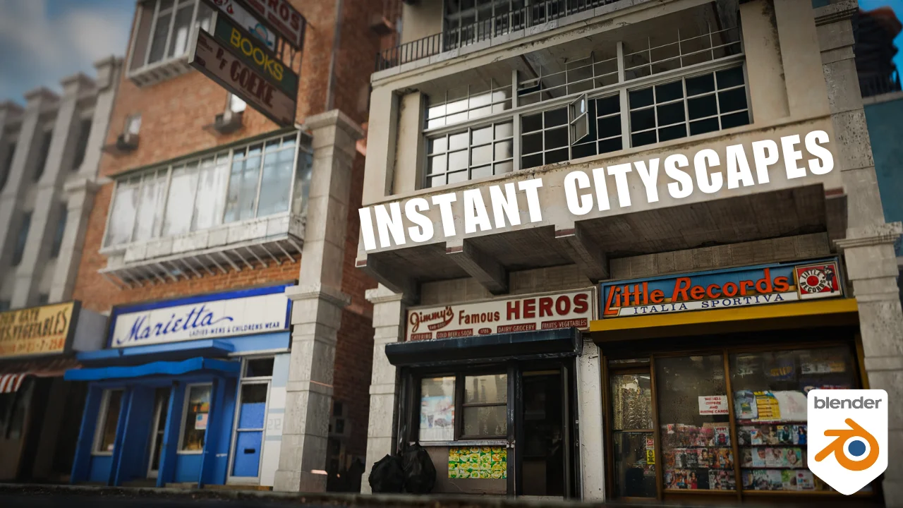 This collection provides over 380 modular assets and props for constructing urban environments in Blender. The kit includes more than 250 modular building components such as walls, doors, windows, and balconies, alongside 10 pre-made store fronts and 15 awnings. It also features over 100 street and rooftop decoration props including signs.