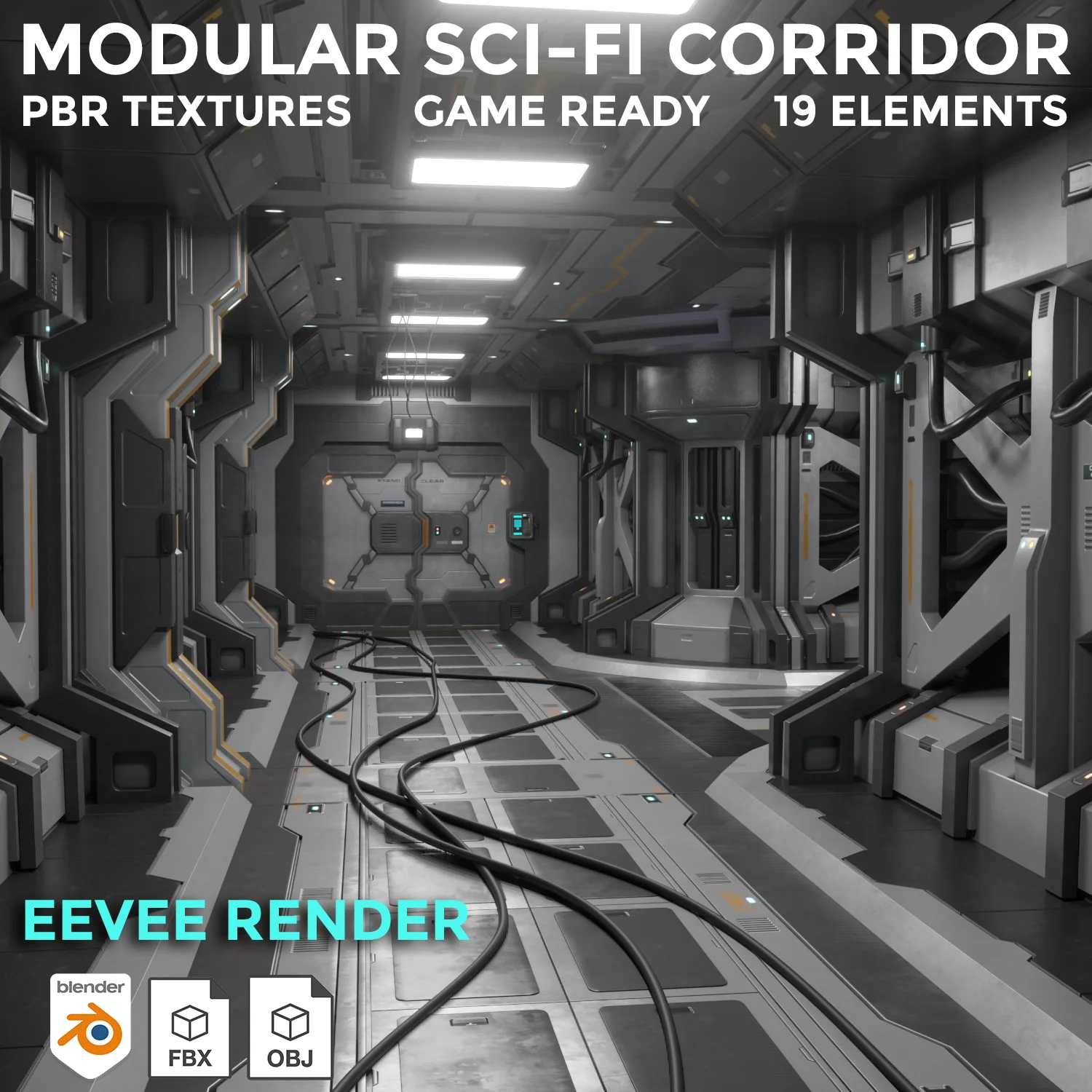 This product provides a collection of modular, low-poly 3D models for constructing sci-fi corridors. Modeled to real-world scale, the kit includes 19 distinct parts, such as separated doors that can be animated or used interactively. The total polygon count across all pieces is roughly 18,000. It features a pre-assembled demo scene matching the promotional images. The assets use a PBR metalness and roughness workflow, with texture maps provided in 1K, 2K, and 4K resolutions. Formats include OBJ, FBX, and a native Blender file with packed textures configured for the EEVEE render engine.