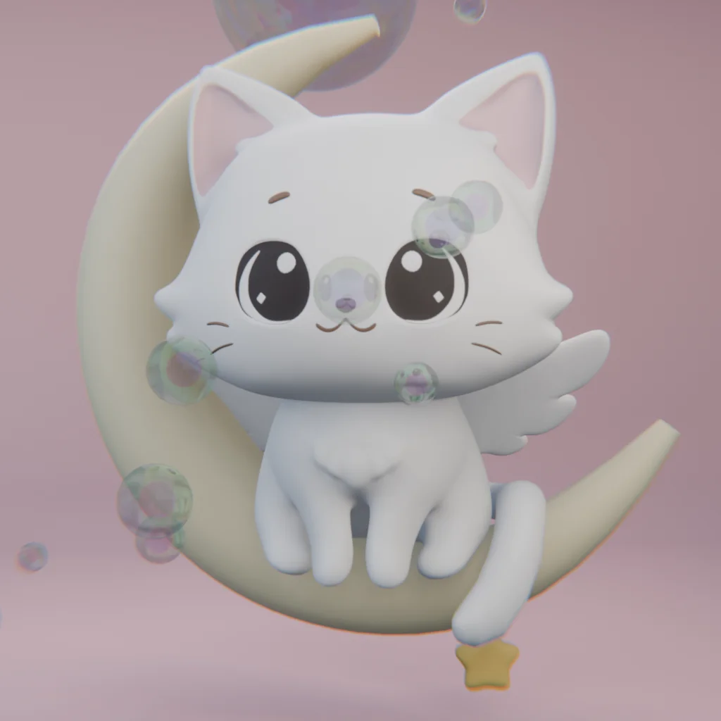 This Blender scene features a posed, low poly stylized Moon Cat character. The setup includes a simple bubble effect configured within the file. It is lightweight and prepared for stylized rendering or personal projects.