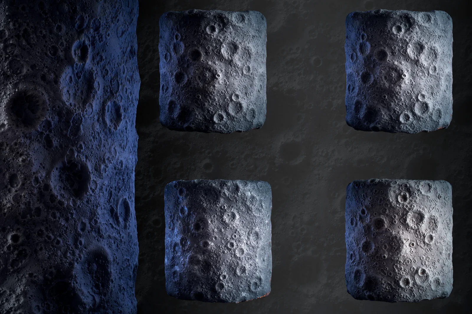 This is a stylized moon surface material designed for space, sci-fi, and fictional environments. It provides a complete set of PBR texture maps, including ambient occlusion, base color, diffuse, glossiness, height, metallic, normal, roughness, and specular maps.