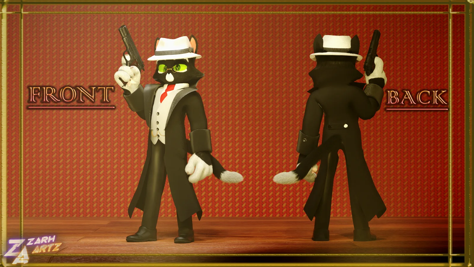 A fully rigged 3D character model of Mordecai Heller from Lackadaisy. The provided Blend file includes configured fur, textures, and two distinct skins. The rig features 19 shape keys for facial expression control. The character consists of approximately 177,412 polygons and includes accessory models such as a fedora hat, a shoulder gun strap, and a Colt 1911.
