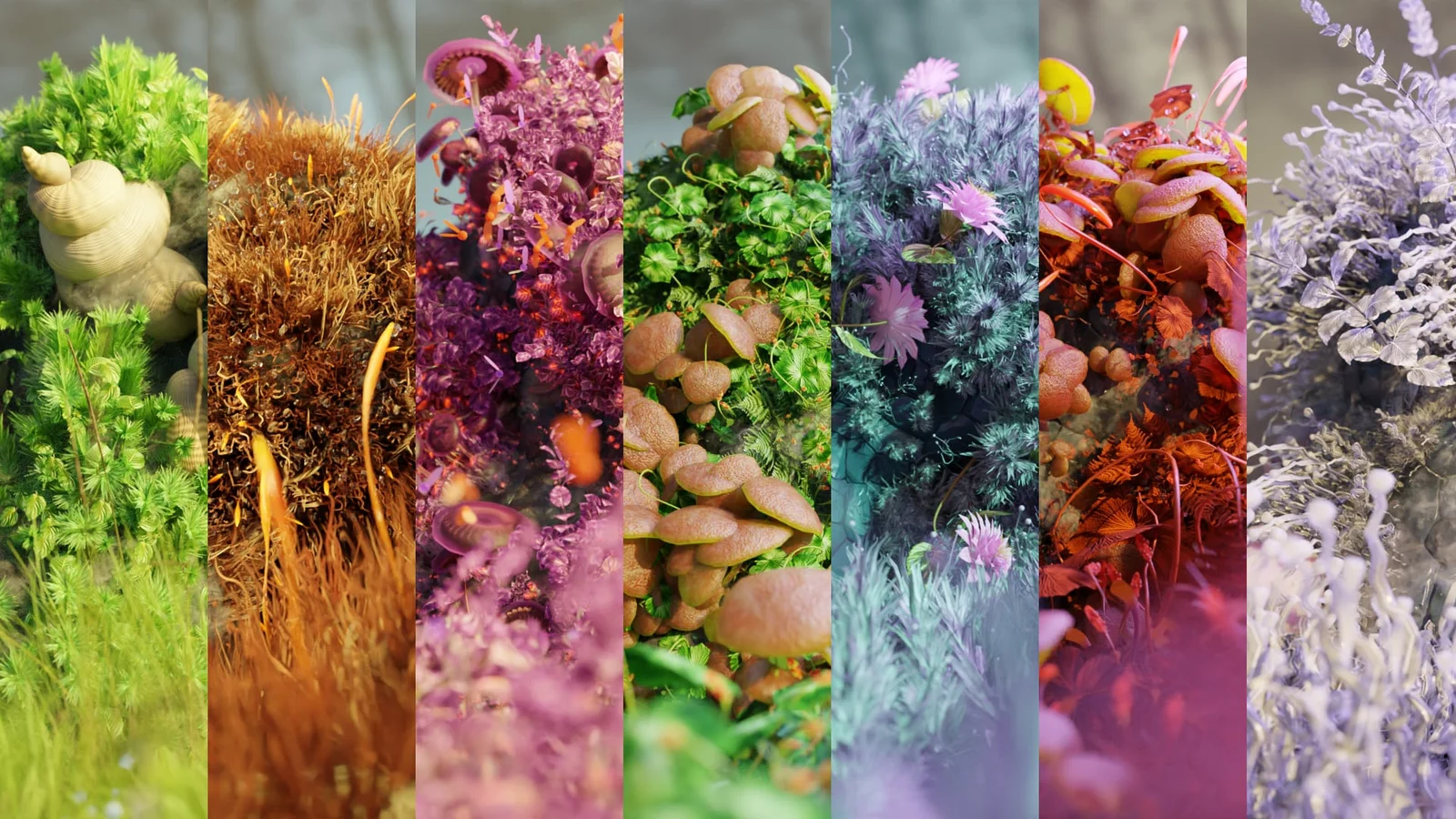 The library utilizes over 50 distinct geometry node setups that enable users to customize the traits of individual moss elements before scattering them. Users can modify existing presets or assemble custom biomes by mixing different assets from the catalog. The collection spans realistic forest ground cover to stylized environments like luminous blossom and glowing alien biomes.
