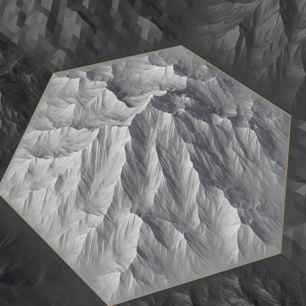 This Geometry Nodes modifier generates eroded mountain formations directly on a grid. It constructs the terrain based on an attribute selection using the shortest path node, where path costs are influenced by noise to create varied natural patterns. Performance may degrade when applied to high-resolution grids.
