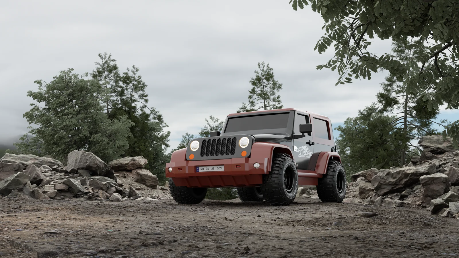 This is a pre-configured mountain landscape scene designed for Blender 3.5 and the Cycles render engine. The composition features modified free assets sourced from Sketchfab and 3D Warehouse, including terrain elements, hills, and a Jeep Wrangler model.
