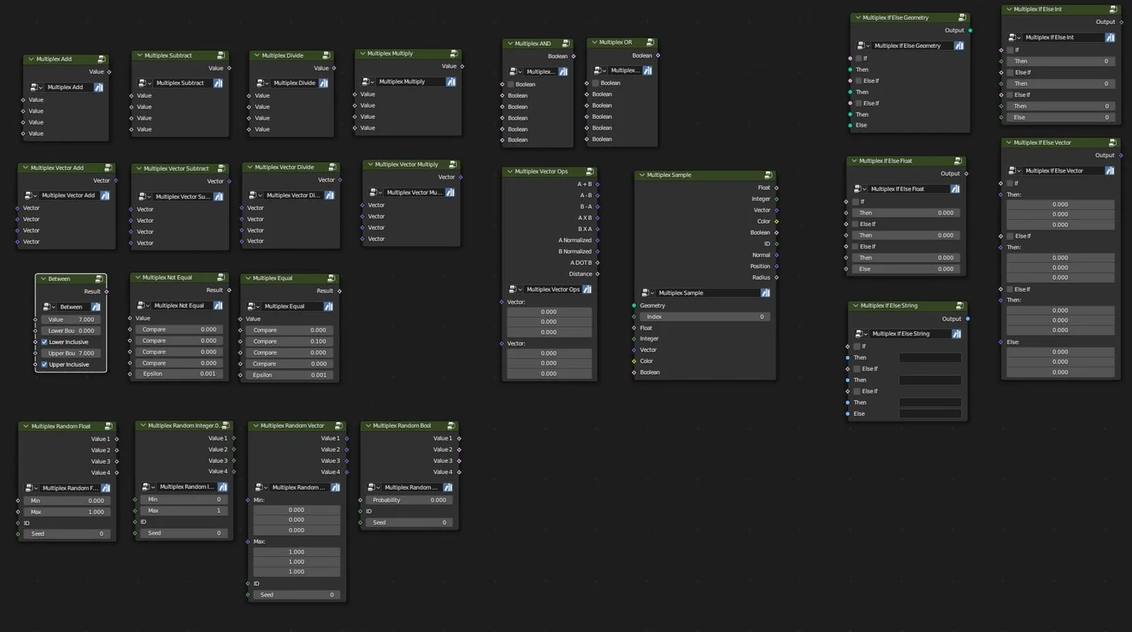 This collection provides a set of utility nodes for Geometry Nodes designed to reduce the need for long chains of standard math and logic nodes. It includes multiplexed add, subtract, multiply, and divide operations for both floats and vectors, accommodating up to four inputs simultaneously. Similar consolidation is applied to logical operations, offering And, Or, Equal, and Not Equal nodes that take up to six inputs.