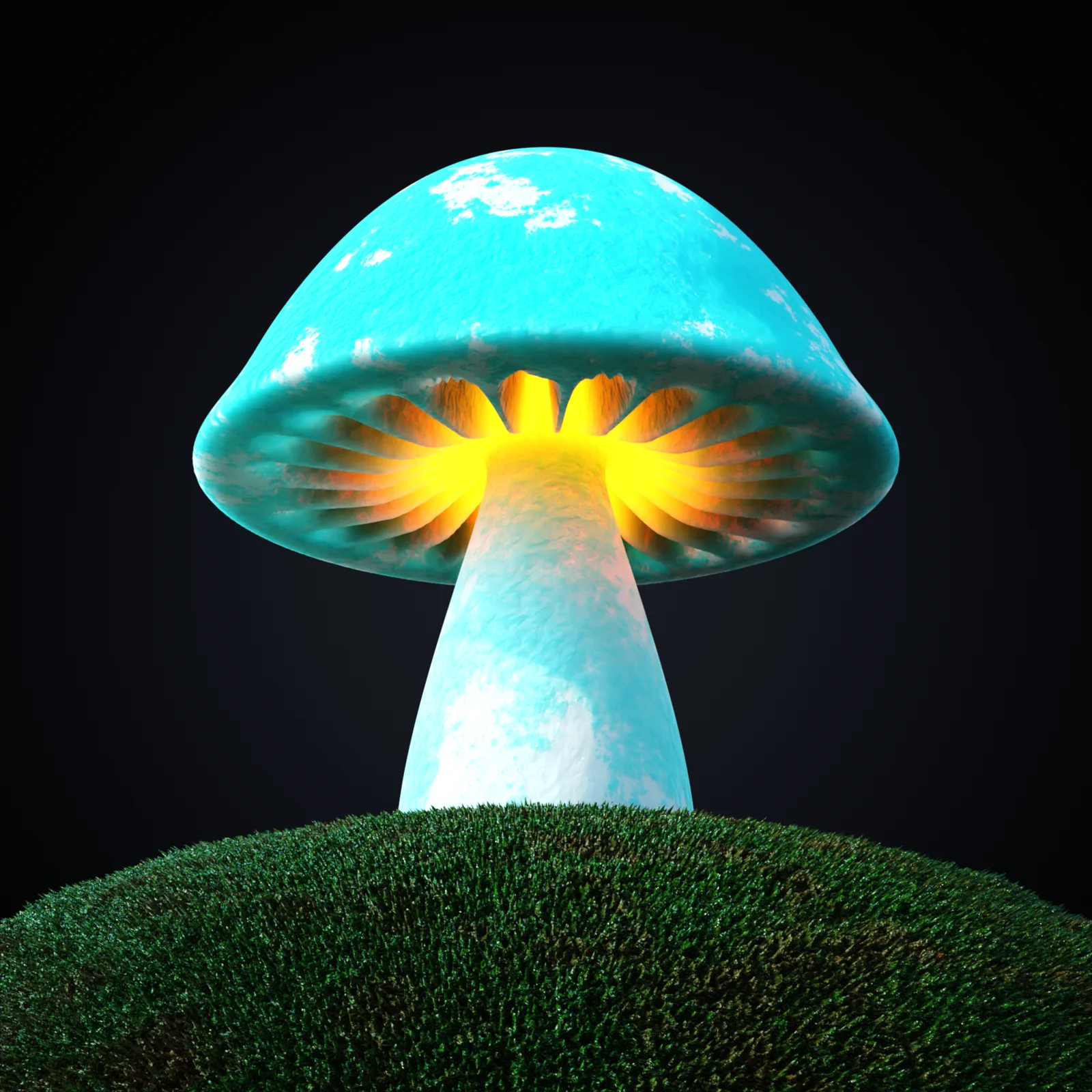 A fully procedural mushroom material designed for the Cycles render engine. The setup utilizes vector displacement nodes to generate the complex shape and surface texture of a fungus starting from a basic subdivided cube.