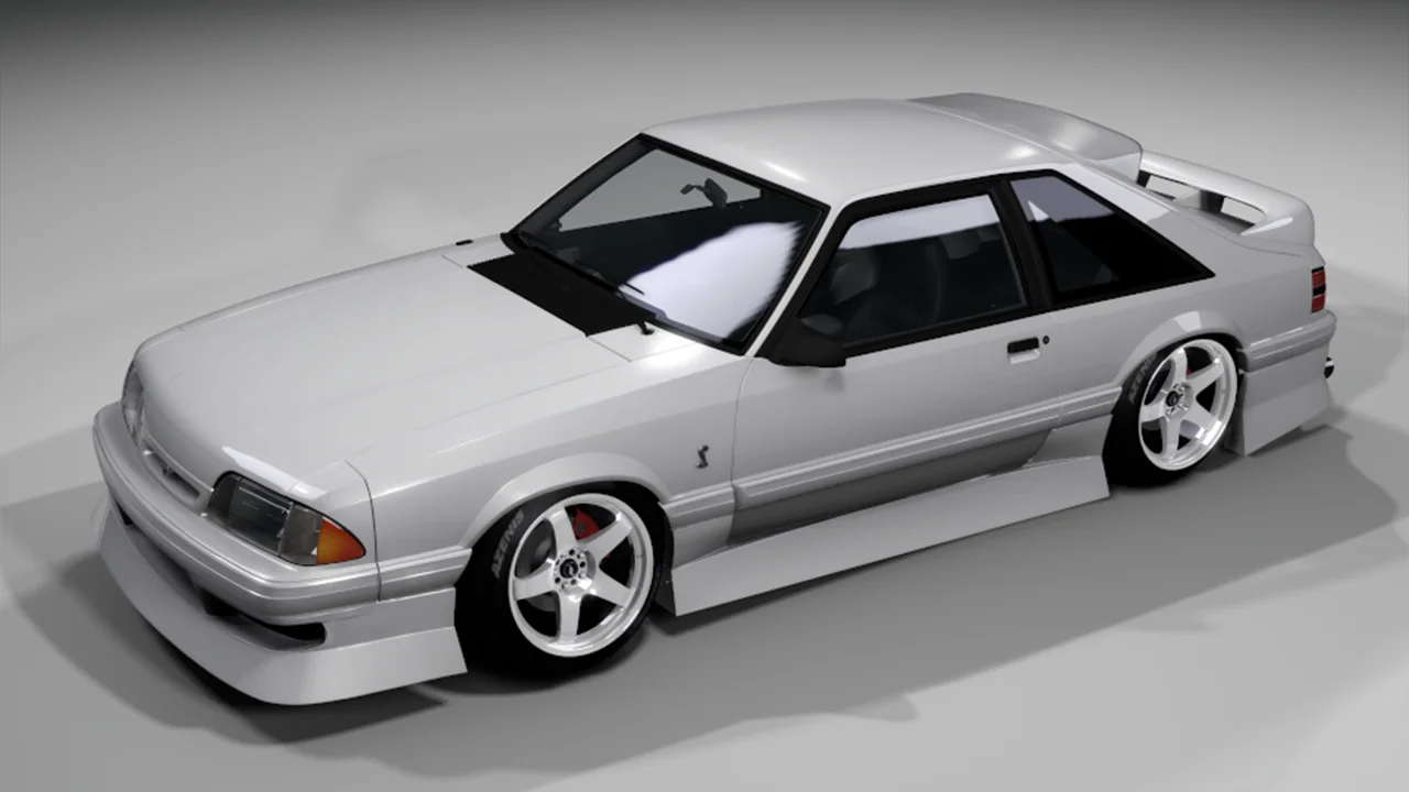 This 3D model provides a custom concept body kit designed for the Mustang Foxbody. It is modeled specifically to fit the Forza Horizon 2 base model and is compatible with both fastback and notchback variants. The geometry is built from scratch and consists of 34,654 triangles.