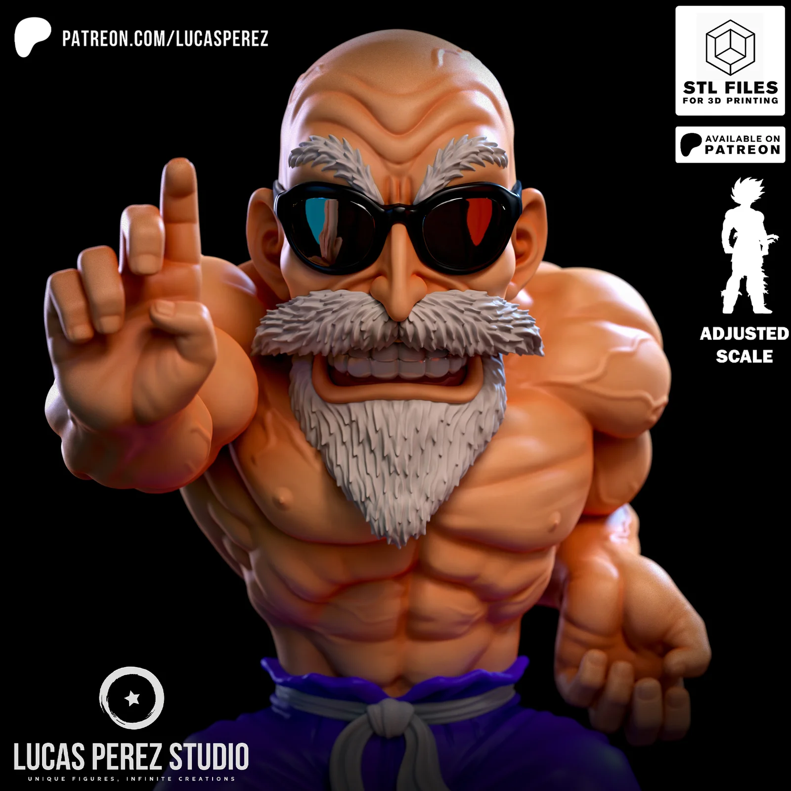 A static 3D character model designed and segmented for 3D printing. The model is cut into smaller pieces to facilitate printing and assembly, with an emphasis on SLA and SLS resin technologies, though it can be scaled for FDM printers. Reference images are included to guide the painting process.
