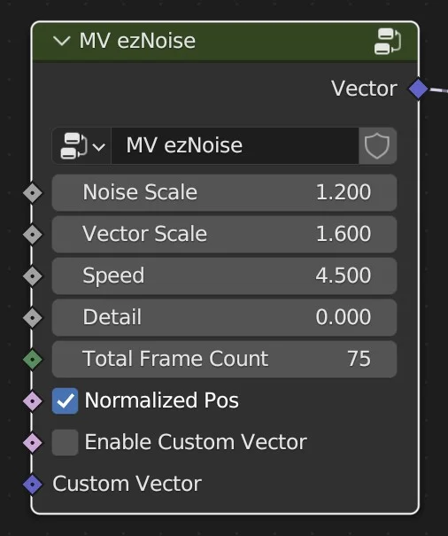 MV ezNoise is a geometry node group designed specifically for animating point clouds. It provides a streamlined interface for generating noise-based movement, allowing users to connect the vector output directly to the offset input of a Set Position node. The setup includes built-in functionality for creating seamless animation loops based on a defined total frame count.