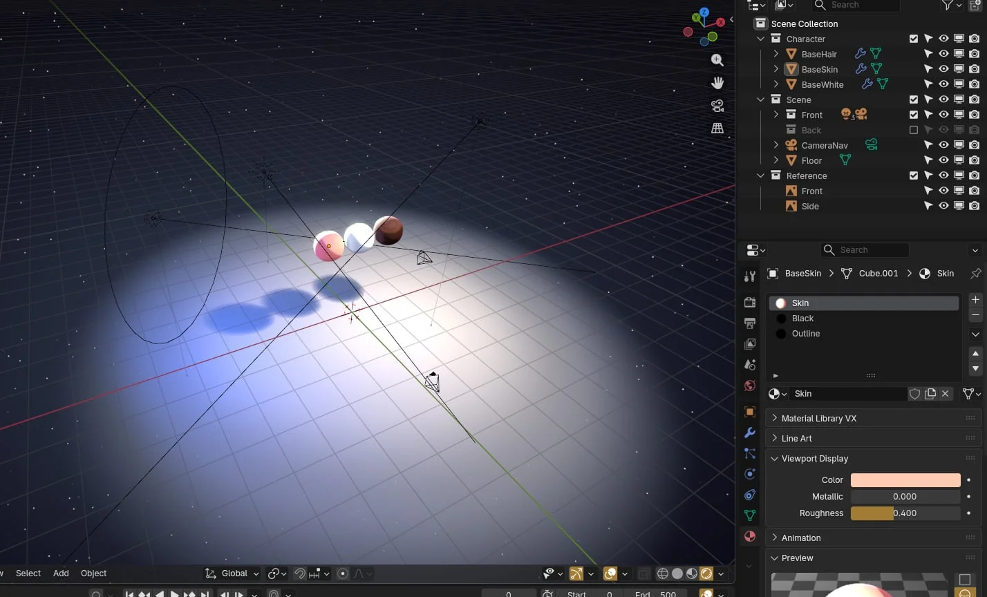 A pre-configured starter scene designed to accelerate character modeling and rendering workflows. The environment includes a starry background and floor, a three-point lighting setup with secondary backlights, and pre-positioned cameras.