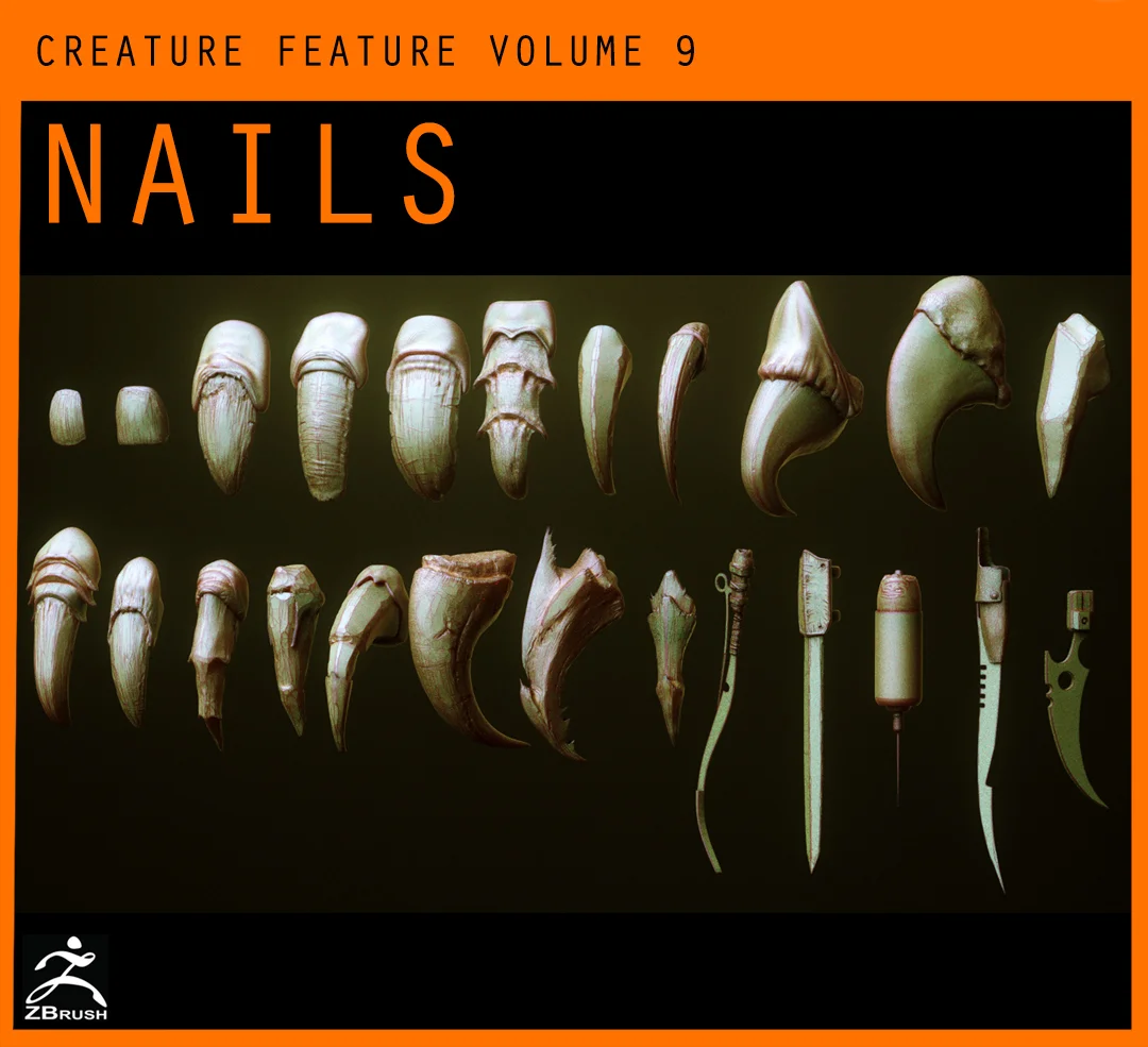 This asset pack provides 24 pre-sculpted nail models designed for characters and creatures. The meshes have been decimated to optimize poly count while preserving surface detail, allowing them to be quickly appended to existing character sculpts or hands. They are provided in standard FBX and OBJ formats, making them suitable for use as kitbash elements in standard character workflows.
