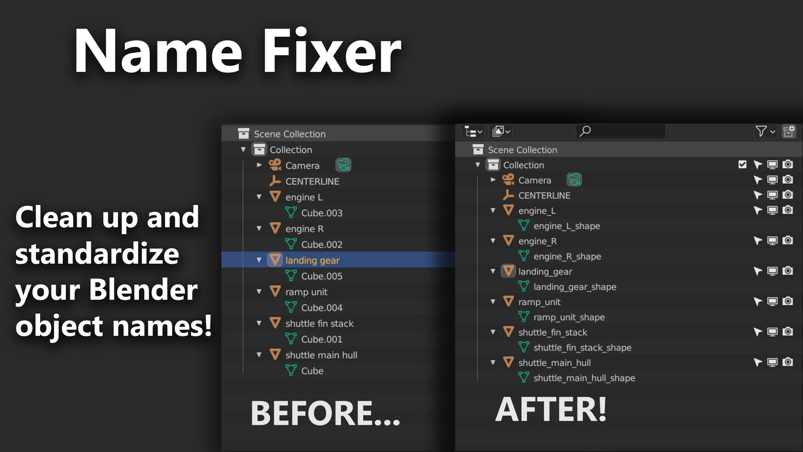 Name Fixer is a utility add-on that automates the renaming of object and shape datablocks. When run on selected objects, the tool automatically replaces all spaces in object names with underscores to ensure compatibility when exporting to other 3D applications. Additionally, it synchronizes shape datablock names to match their corresponding object names by appending a shape suffix, resolving the common issue of disorganized default geometry names in the outliner.