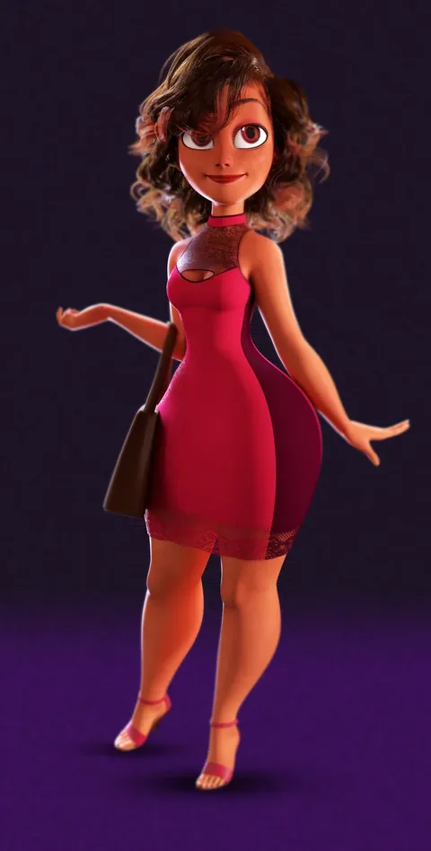 The character is rigged using the Rigify-based AXIS Rig System, which includes IK/FK controls alongside bone-driven shape key corrections for smooth mesh deformation during animation. It features a complete particle hair grooming system with customizable materials. The provided materials use labeled node networks and are separated into specific zones for skin, eyes, mouth, tears, and clothing.