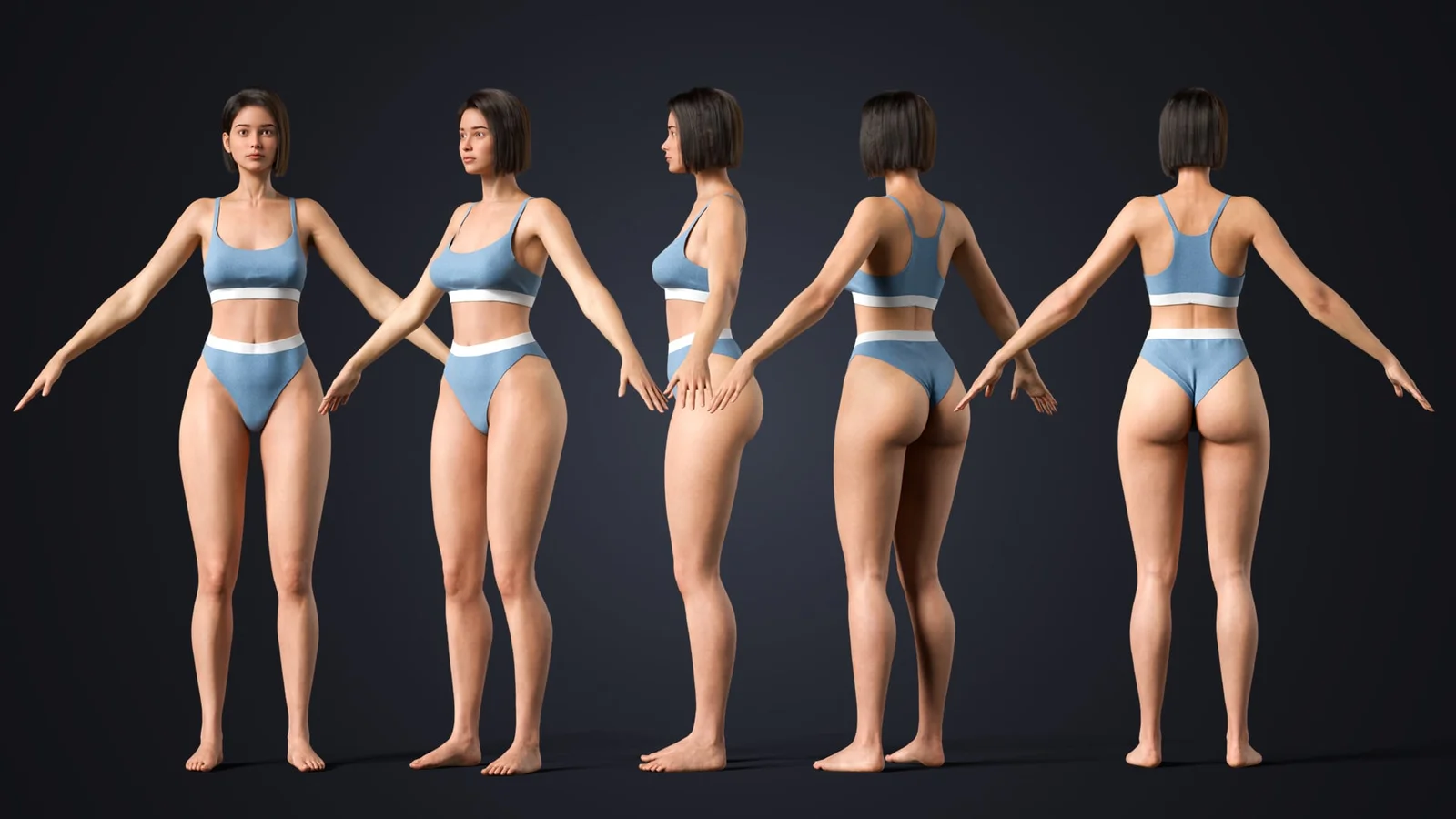 A realistic, fully rigged female 3D character model optimized for cinematic rendering in Blender's Cycles engine. The model features a clean, quad-based topology with a multiresolution modifier providing three sculpt levels for rendering fine geometric variations. Texturing utilizes a UDIM-based UV layout, complete with 8K displacement maps and 4K PBR texture sets covering albedo, roughness, subsurface scattering, and normal maps.