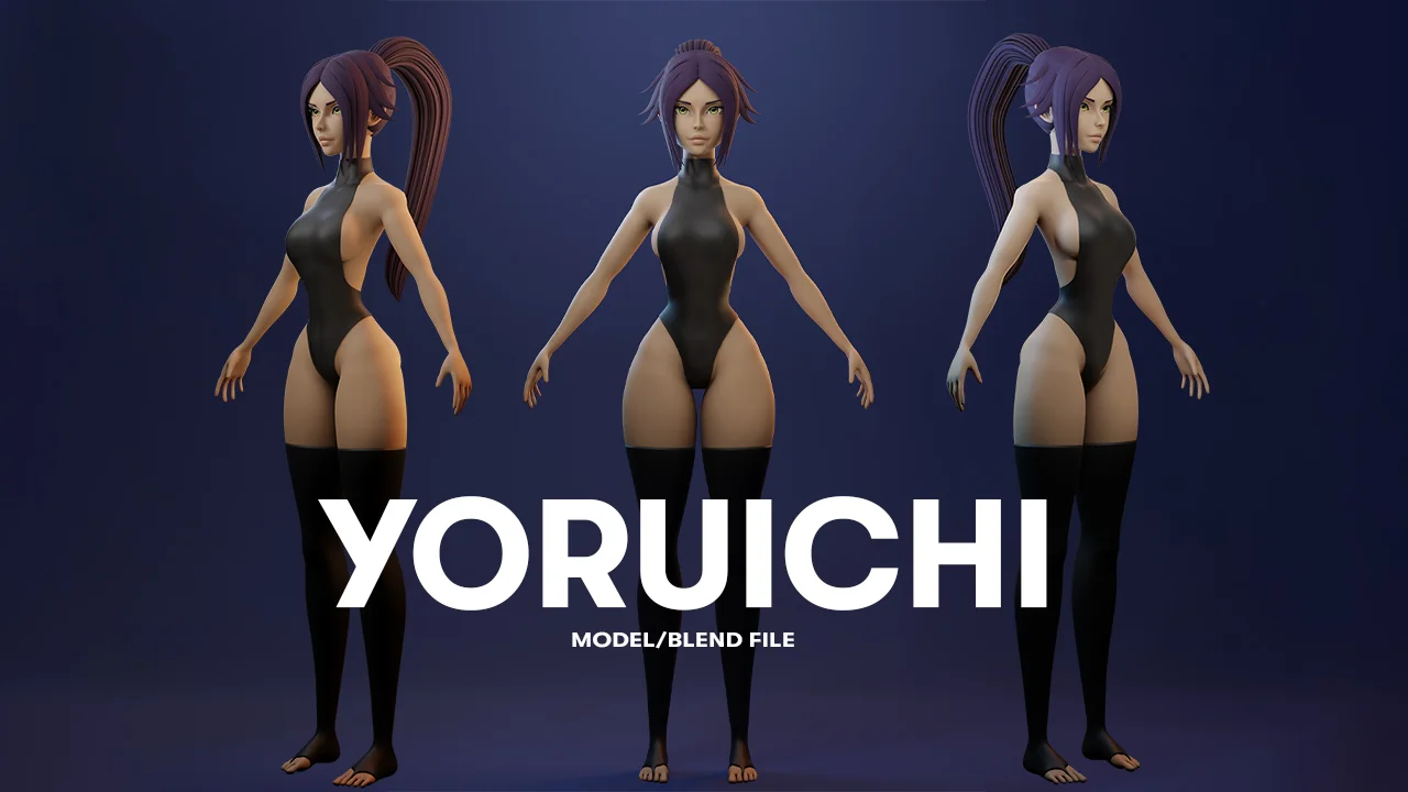 This is a fully rigged 3D character model of Yoruichi formatted for Blender. The file includes the base character model alongside fitted hair and clothing assets. It features an Auto-Rig Pro (ARP) armature complete with facial, finger, and breast rigging controls. A bonus sci-fi skinsuit outfit is also included and fully rigged to the base model.