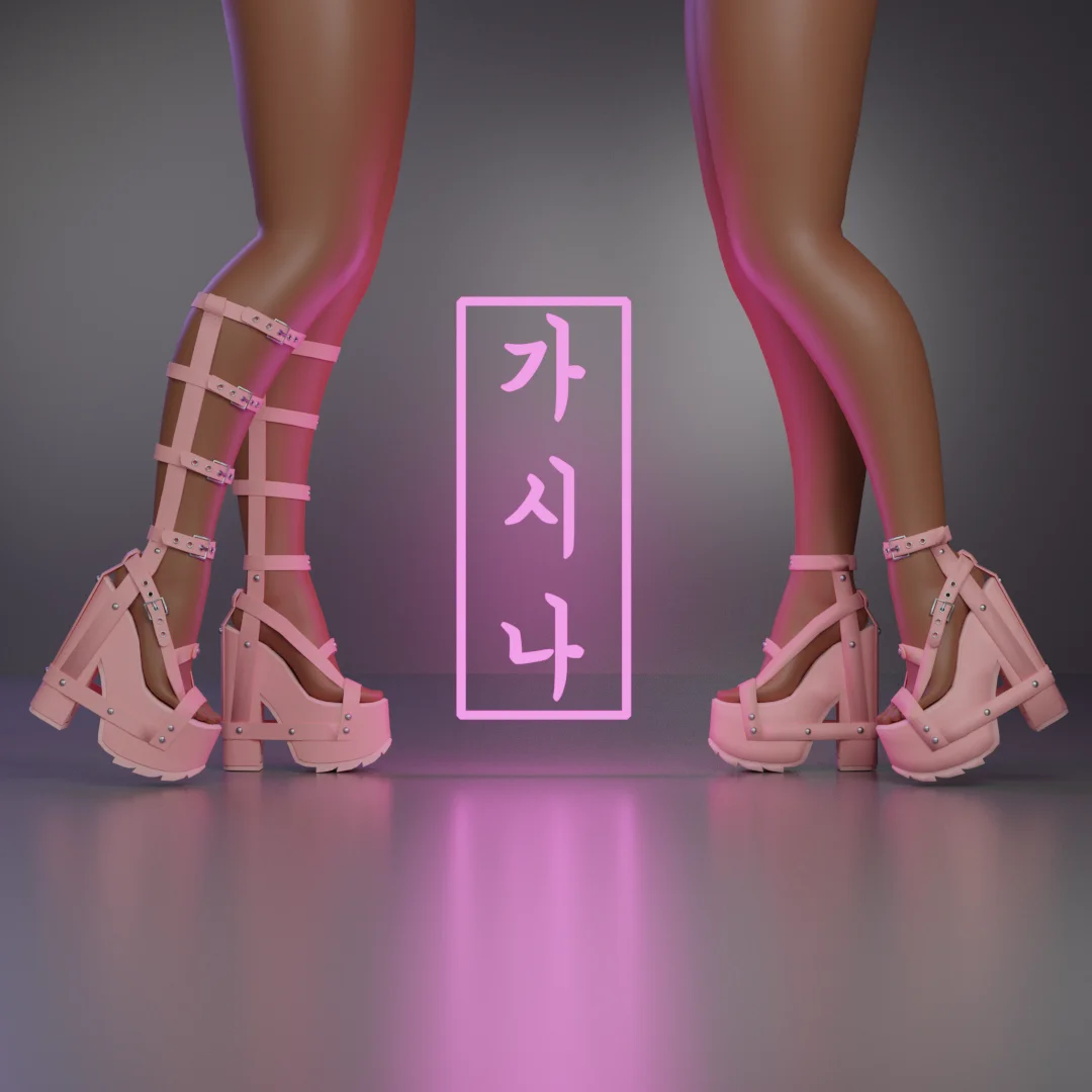 The Nightcall Platform Boots are a 3D clothing asset created in Blender and textured in Substance Painter. The product includes two versions of the boots, provided in FBX format, alongside PBR texture maps. Version 1 consists of 16,486 triangles, while Version 2 has 10,454 triangles. The mesh is modeled to fit the Pandaabear heeled female base.