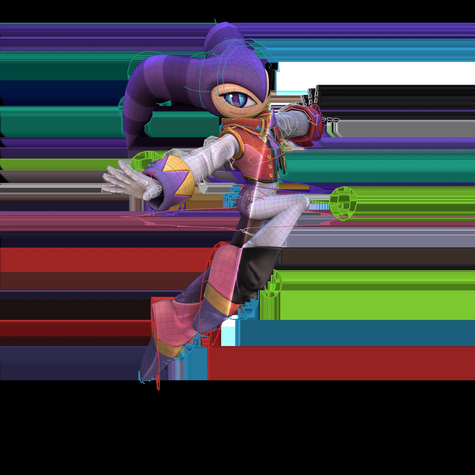 An animatable character rig of NiGHTS built for Blender. The model features intuitive animation controls, a detailed polygon mesh, and a system for facial expressions. The rig also includes support for alternate character colors.