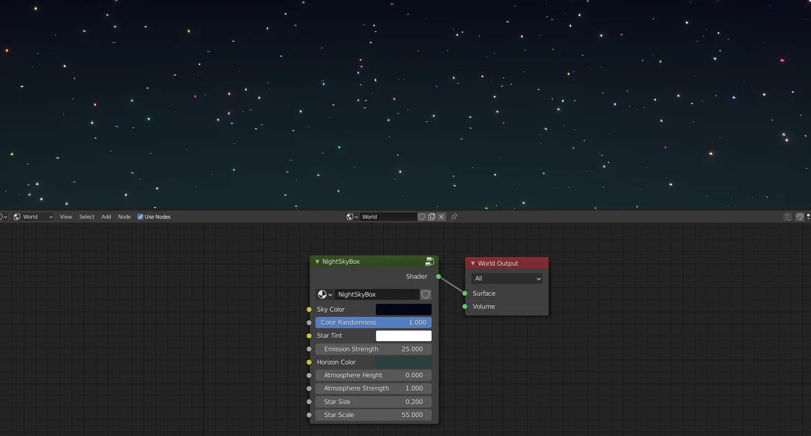 NightSkyBox provides a world node group designed for creating night sky environments in Blender. The setup includes adjustable controls for generating stars, modifying sky colors, and tweaking atmospheric effects. It is intended to be appended to existing projects and applied within the world material node tree. The creator recommends enabling the Bloom effect for optimal visual results.