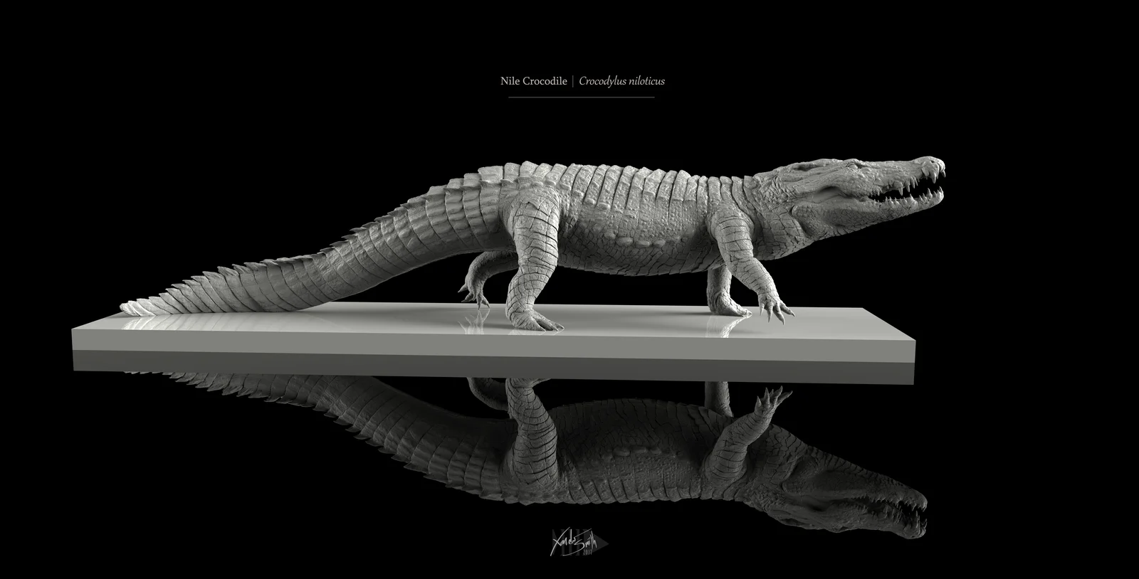 A detailed 3D model of a Nile crocodile. The model is provided in a T-pose and a walking pose. It includes low-poly and high-poly decimated versions, as well as a ZBrush file with subdivisions for posing adjustments. UV mapping, displacement maps, and bump maps are included.