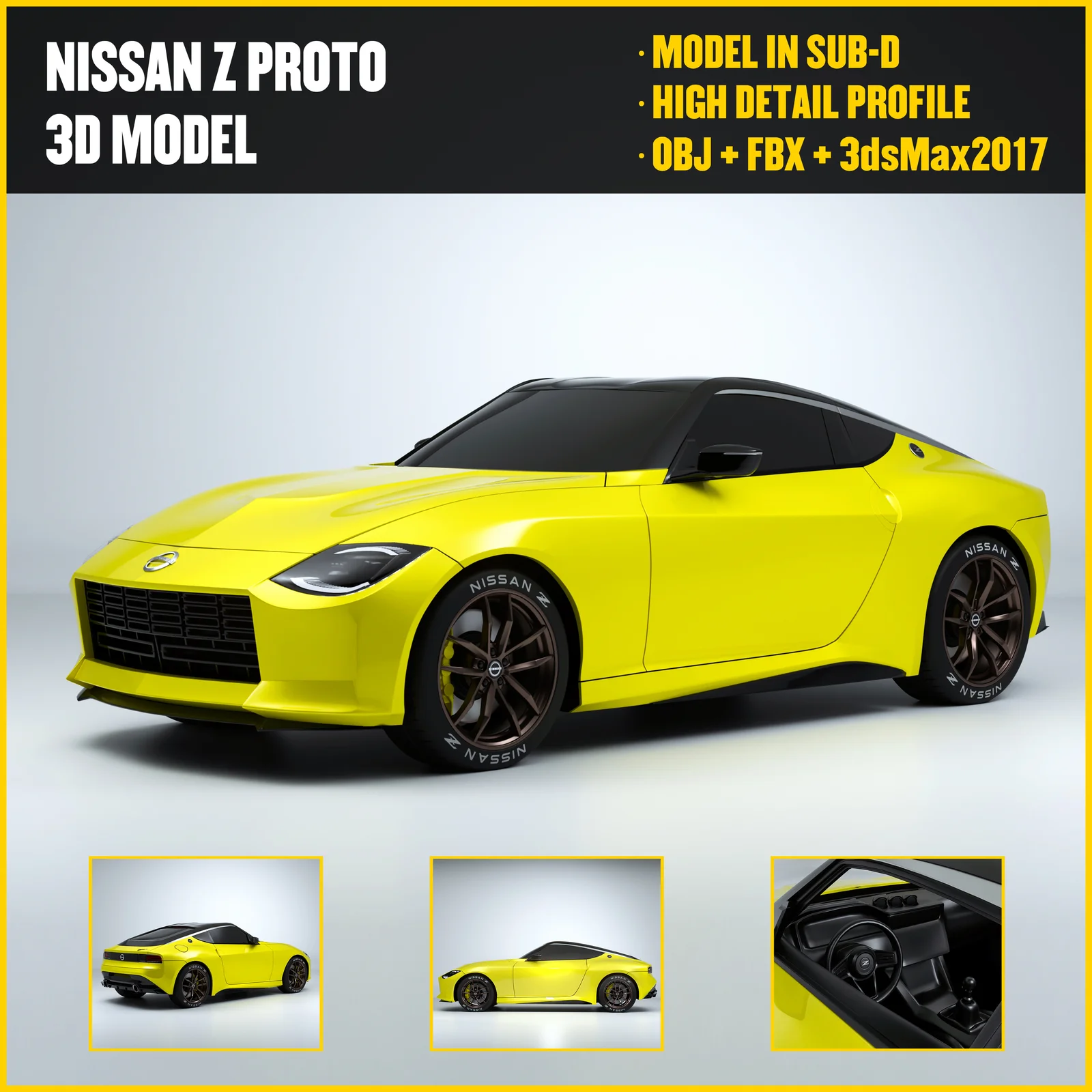 A 3D model of the 2020 Nissan Z Proto concept car. The asset features a highly detailed exterior combined with a low-profile interior layout. The geometry is structured with low-poly, editable parts to allow for easier modification and customization. It is provided in OBJ and FBX formats for import into Blender and other 3D software.