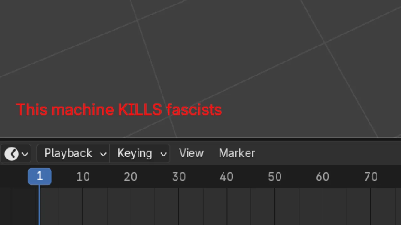 This add-on places the text "This machine KILLS fascists" in red letters at the bottom left corner of the 3D viewport. It functions as a static UI overlay and is visible while working in the 3D view.