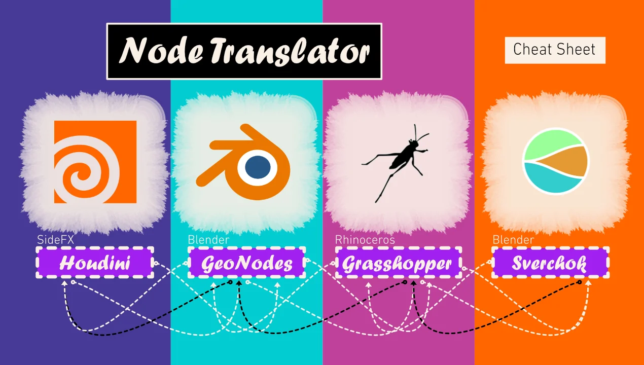 Node Translator is a reference guide mapping equivalent nodes across four major visual programming tools: Blender's Geometry Nodes, Sverchok, Houdini, and Grasshopper. It acts as a cheat sheet for 3D artists and designers transitioning between procedural environments, helping them find familiar functions across different software interfaces and terminologies.