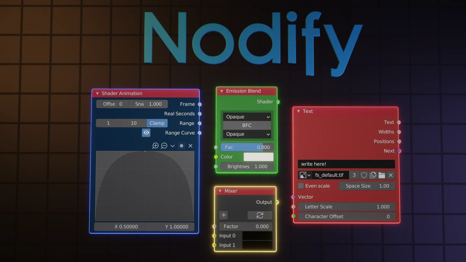 Nodify is an addon that expands Blender's Shader Editor with custom nodes designed to streamline material creation. It integrates directly into the standard node menus, adding four specialized tools: Shader Animation, Mixer, Emission Blend, and Text.
