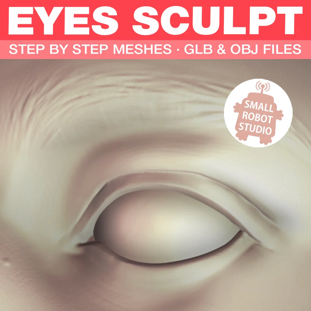 This reference pack provides 3D meshes designed to assist in sculpting eyes and foreheads. It includes a sequence of step-by-step meshes demonstrating the sculpting process, along with a separate sculpt highlighting the primary facial planes of the eye and forehead region. The assets are provided in both GLB and OBJ formats, allowing them to be imported into any compatible 3D software for use as visual references during character creation.