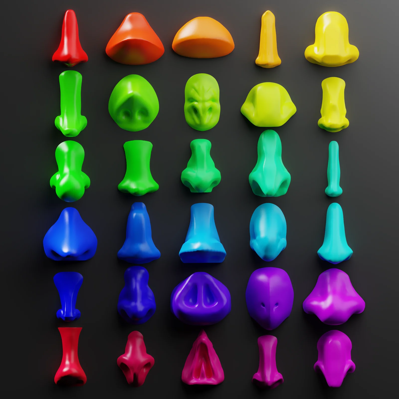 Nose Machine is a collection of 30 3D nose models intended for character exploration and sculpting workflows. Provided as FBX files, these basemeshes can be imported into Blender to quickly test different nose shapes on a character before continuing with custom sculpting and refinement.
