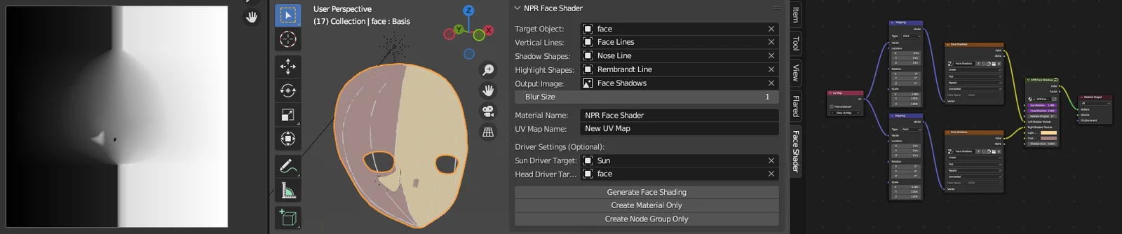 NPR Face Shader is an addon that simplifies the creation of smooth, non-photorealistic lighting on character faces. It functions as an alternative to normal editing by allowing users to place shadows using drawn grease pencil lines.