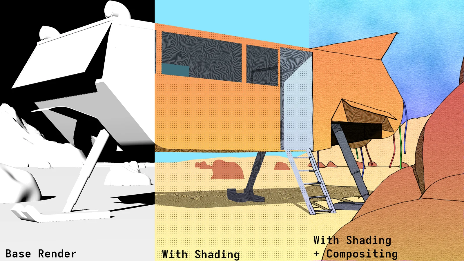 The included compositor setup offers linework generation with adjustable thickness, color, and filtering. It also provides a suite of stylized post-processing effects, including animated wobbling, CMYK misalignment, background gradients, watercolor texturing, image softening, and both Gabor and white noise controls.