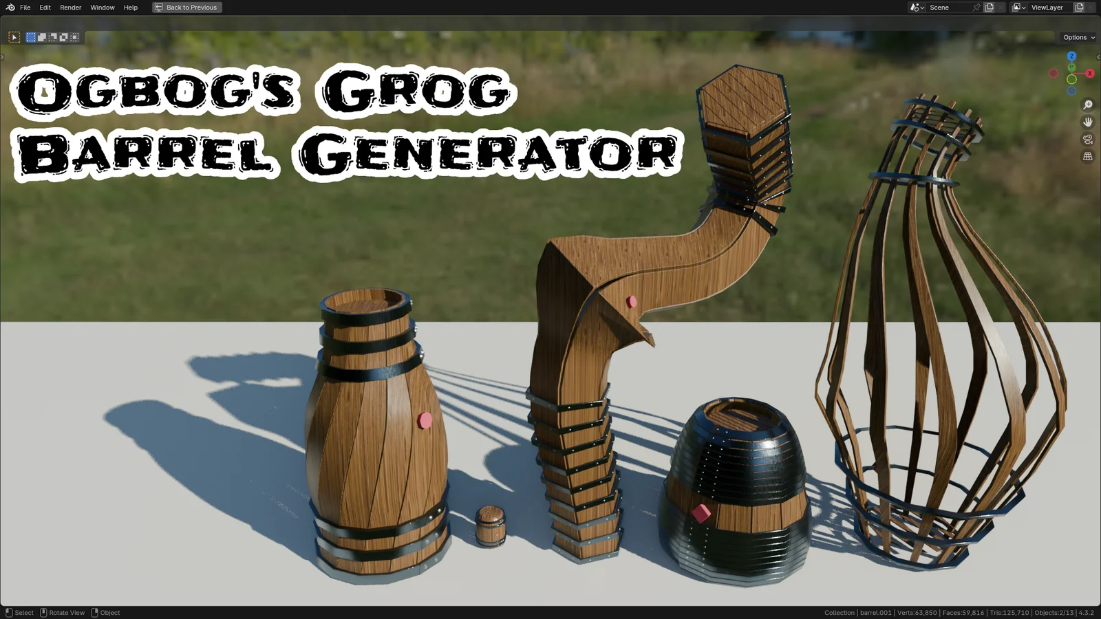 Ogbog's Grog Barrel Generator is a geometry nodes setup that creates 3D barrels based on a curve input. By editing the curve with Bezier controls, twisting, and radius scaling, users can define the exact profile of the barrel. The setup includes customizable parameters for adjusting staves, hoops, heads, rivets, and the bung. A low-poly output toggle is included to assist with baking workflows, and the generator can be repurposed to create abstract cylindrical cage structures.