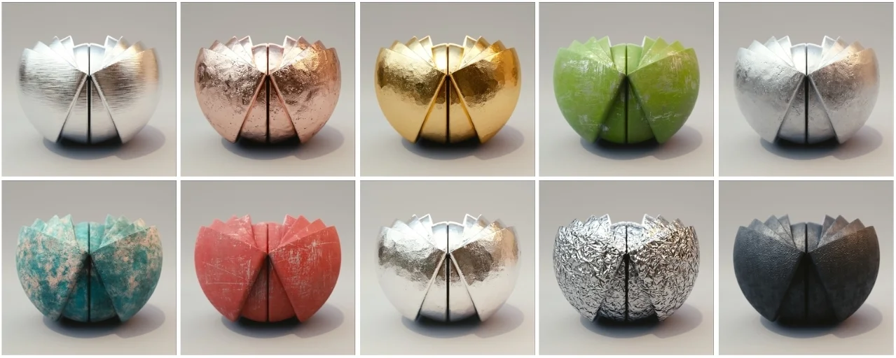 A collection of 10 physically based rendering (PBR) metal materials. Each material includes Albedo, Roughness, Metallic, Normal, Ambient Occlusion, and Displacement maps. The textures are provided in 1K, 2K, and 4K resolutions to fit varying detail requirements and memory budgets.