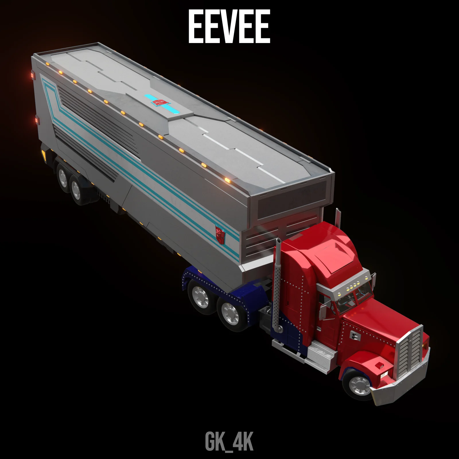 This is a rigged 3D model of Optimus Prime's vehicle mode based on Transformers: Prime. The asset includes both the truck and its trailer, featuring an interior cabin detailed with dials, screens, and switches. The model comes with fully baked 4K textures that are ready for the EEVEE render engine. It is prepared for animation using a setup based on the Rigacar add-on.