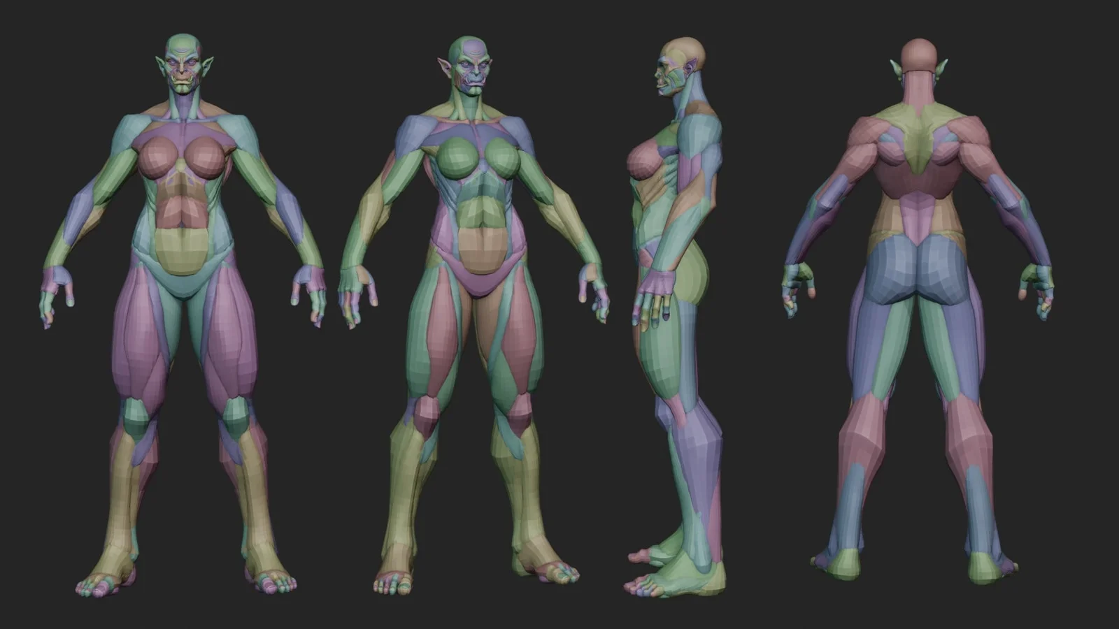 A stylized female orc warrior anatomy blockout for character creation. The base mesh is separated into distinct body parts, including a detailed head structure with defined muscle groupings, eyes, nose, and ears. It also features individual torso, arm, hand, leg, and foot segments to assist with proportion and structure blocking in character pipelines. The asset is provided in .blend, .fbx, and .obj formats.