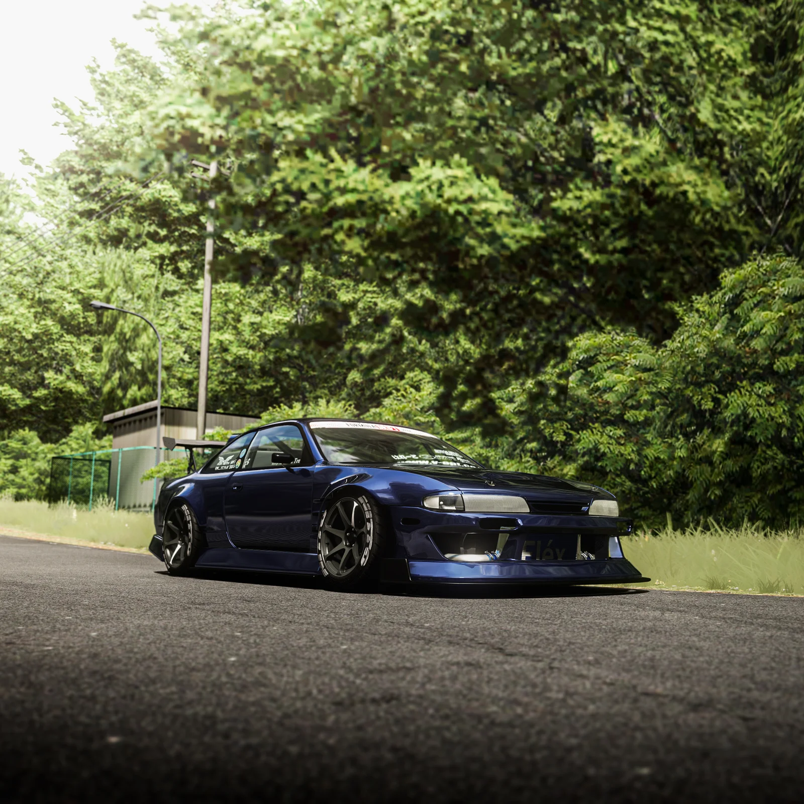 A 3D model of the Origin Labo Driftline bodykit designed to fit the GT7 Nissan Silvia S14 Zenki base model. The package includes a front bumper, rear bumper, side skirts, hood, front fenders, rear fenders, and canards with splitters. The geometry was created using photomatched references for accuracy. Note that the base car model is not included.