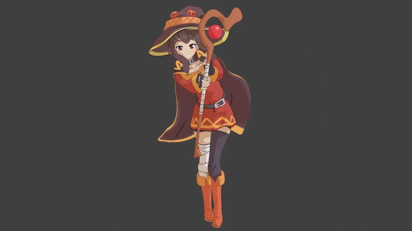 This is a rigged 3D character model of Megumin from the anime Konosuba. The character is set up using Blender's built-in Rigify system for body articulation. It features 52 baked shape keys conforming to the ARKit standard, enabling integration with face tracking applications. The asset includes both standard shadeless materials and hand-painted textures.