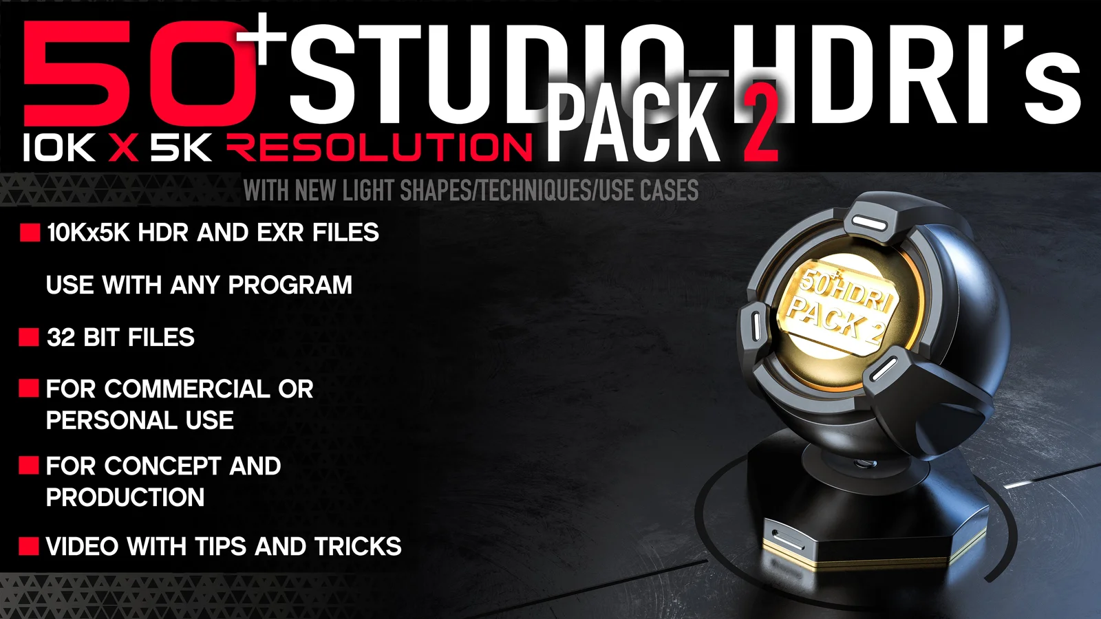 This collection contains 53 studio lighting HDRIs designed for rendering characters, props, and concept designs. Each environment map is provided in both EXR and HDR file formats at a 10k by 5k resolution in 32-bit color depth. The pack includes various studio shapes, lighting setups, colors, and tone variations. It also comes with a short instructional video on HDRI workflows and best practices, JPEG preview images for quick browsing, and a shader ball test scene.
