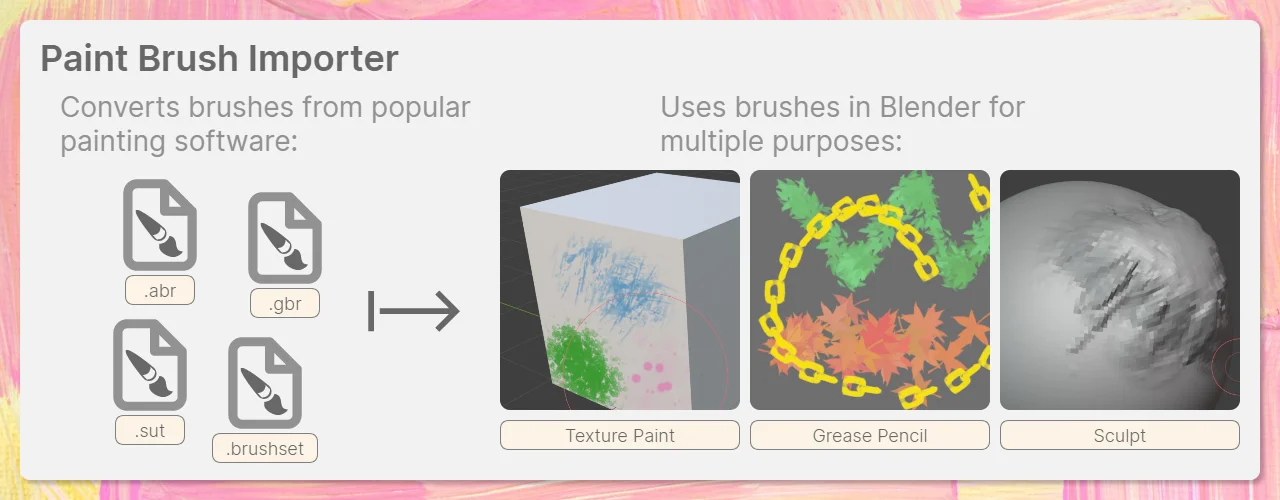 Paint Brush Importer is an add-on that converts brush assets from external painting applications into native Blender brushes. It supports importing several common brush formats, including Photoshop (.abr), GIMP (.gbr, .gih), Procreate (.brushset), and Clip Studio Paint (.sut) files. Users can select multiple brush files at once through the standard import menu.