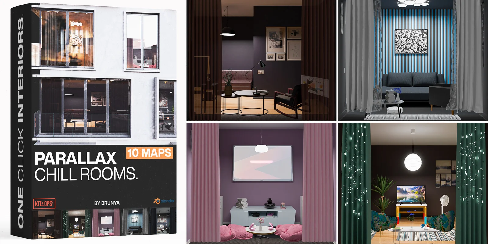 Parallax Chill Rooms provides single-polygon interior environments for architectural visualization exterior scenes. These parallax setups use optical illusions on a single plane to simulate deep room interiors without the geometric cost. The collection includes five distinct room designs, each provided with separate day and night variations.