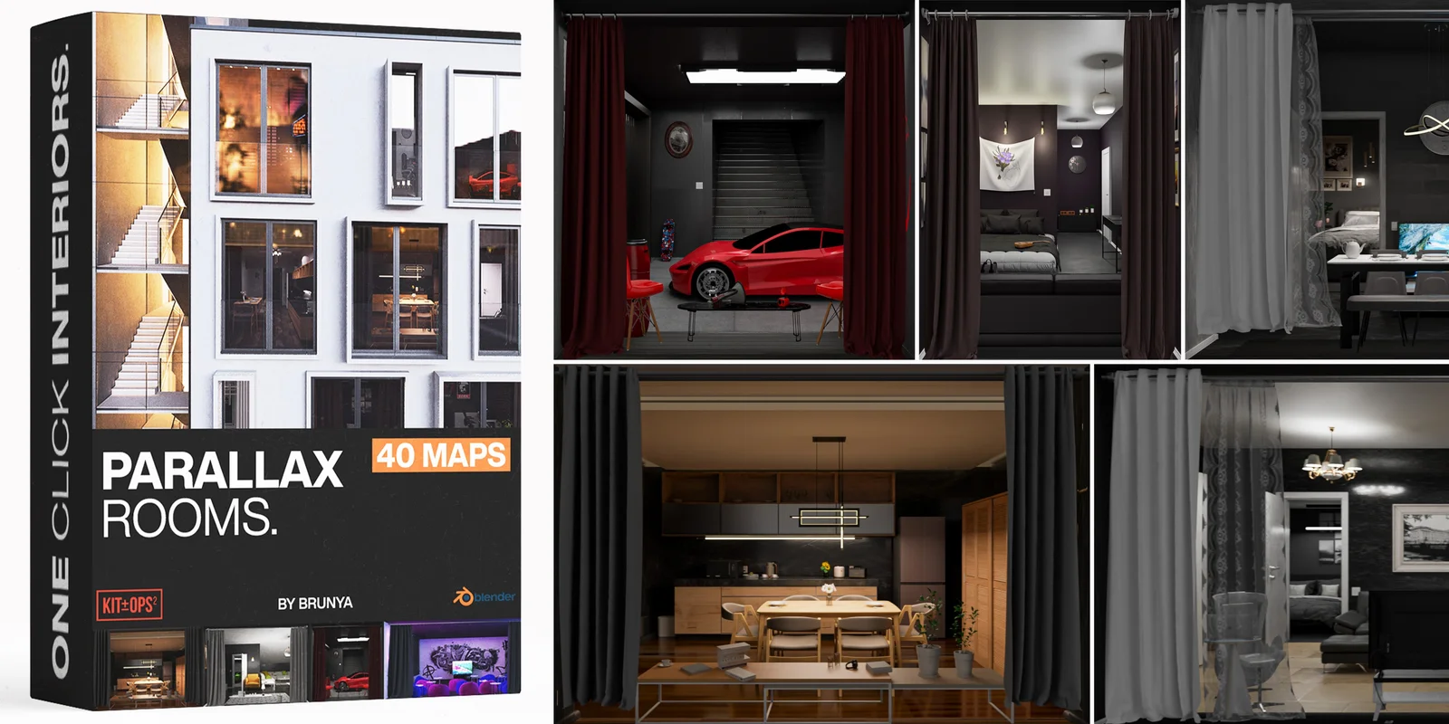 This pack provides 20 parallax room designs intended to populate 3D building interiors using single polygons. Each room design includes both day and night variations, organized into 40 total maps provided as 1K and 3K EXR files. The parallax effect creates the optical illusion of a fully furnished 3D room inside a flat plane, optimizing scene performance for architectural exterior shots while maintaining interior depth.