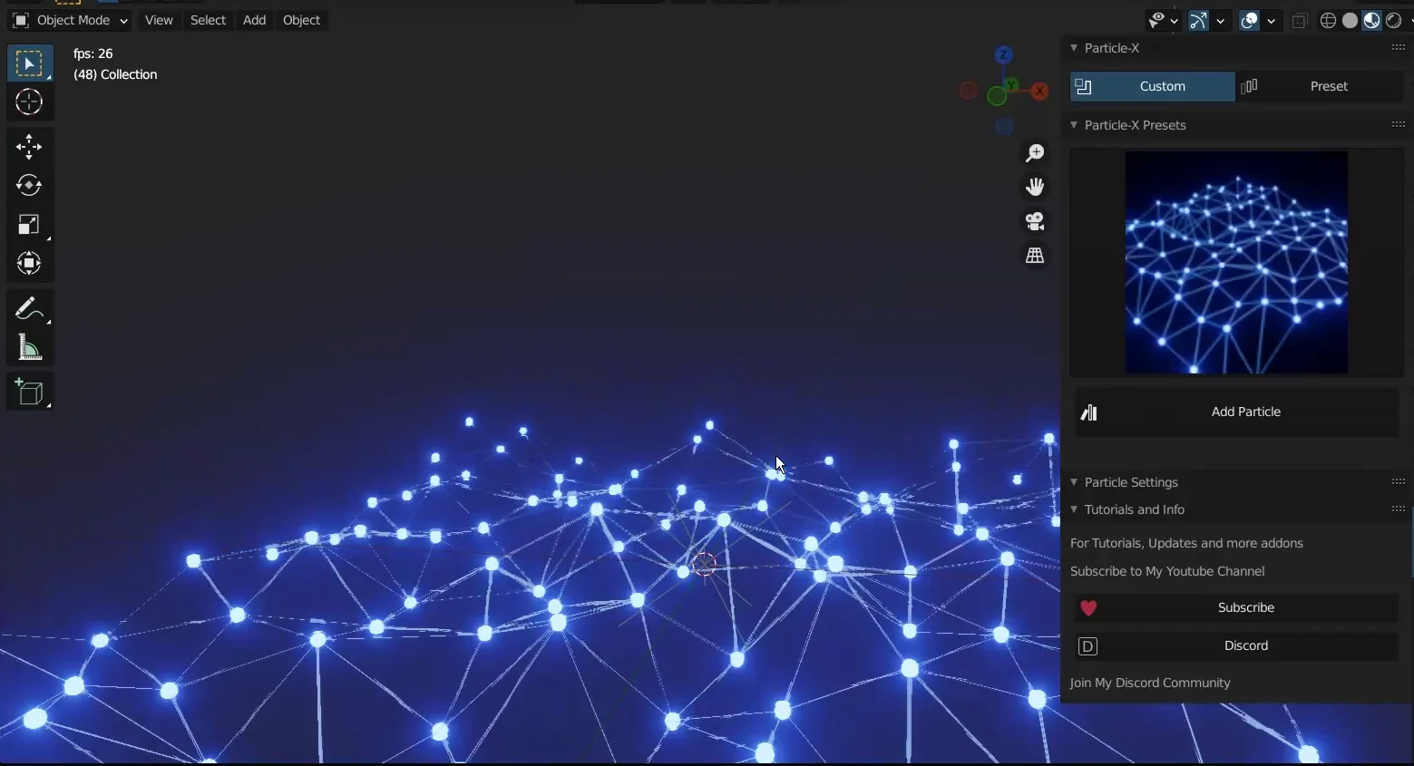 Particles-X is an addon that streamlines the creation and management of particle systems in Blender. It provides a simplified interface for adjusting commonly used particle settings like count, size, gravity, and velocity without navigating the default property panels. The tool includes built-in object types to instance as particles, such as glowing spheres and mirror-material icospheres, alongside options for custom objects and collections.