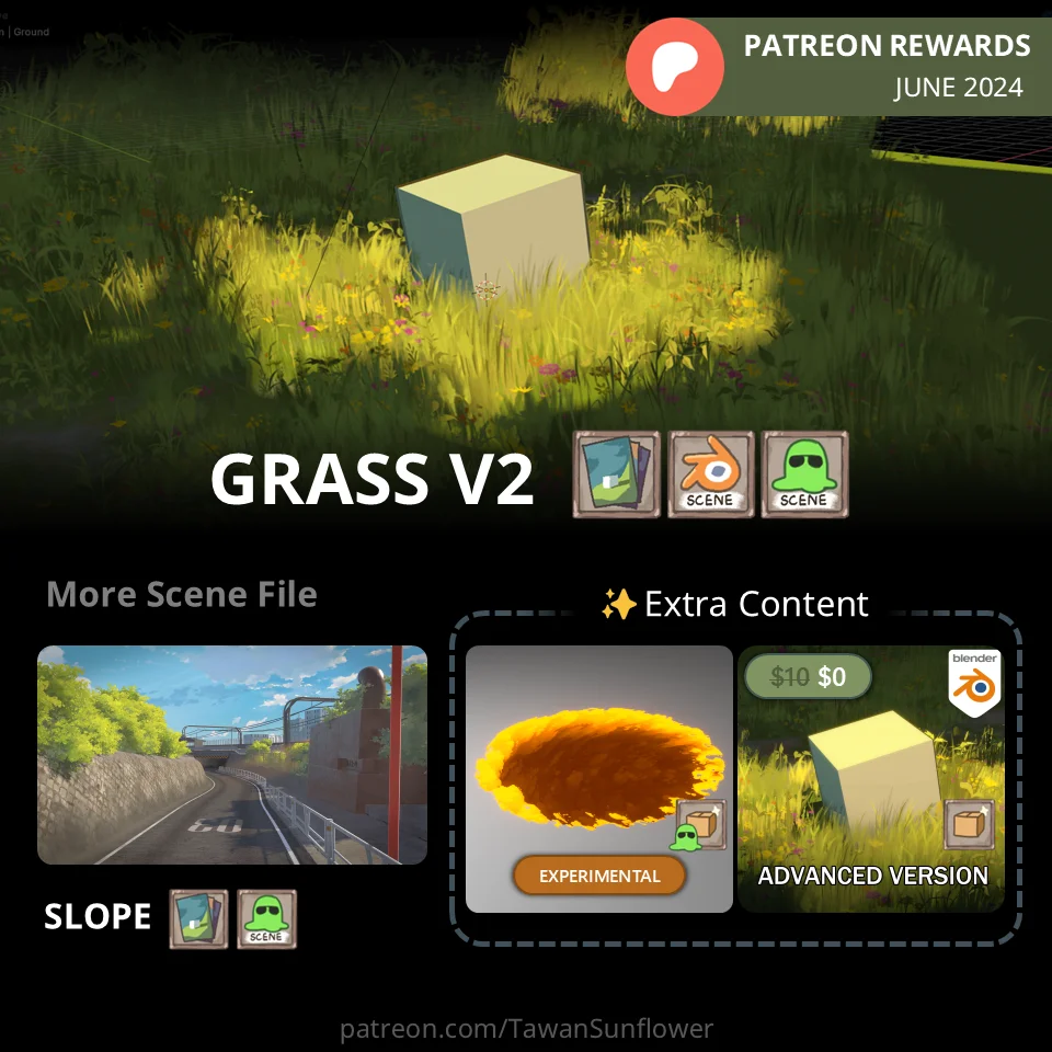 A collection of assets and project files originally released as Patreon rewards in June 2024. The package includes an advanced grass generator compatible with both standard Blender and Goo Engine, alongside a raymarching setup designed exclusively for Goo Engine to generate visuals without traditional geometry.